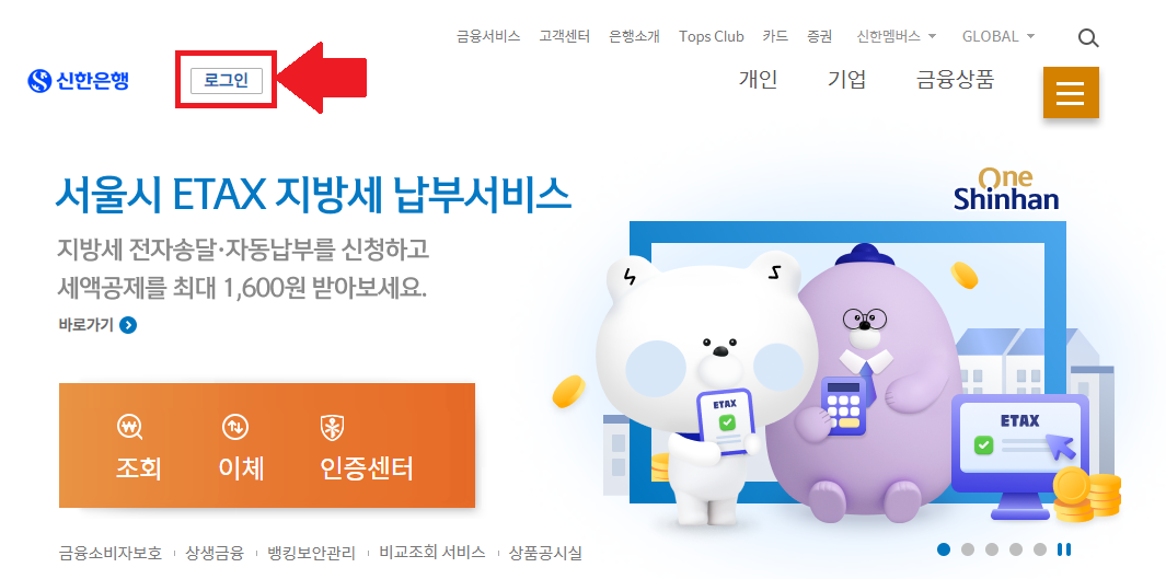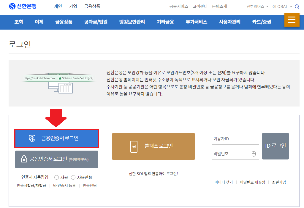 신한은행 홈페이지에 로그인할 수 있는 다양한 방법이 있으나 금융거래확인서 발급을 위해서는 반드시 "금융인증서"를 이용하여 로그인해야 합니다.