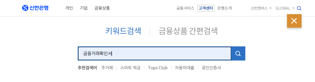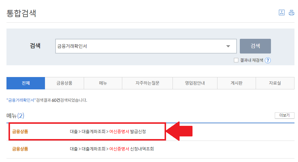 3) 화면 오른쪽 상단에 돋보기 모양을 클릭하고 키워드 검색에 "금융거래확인서"를 검색합니다.