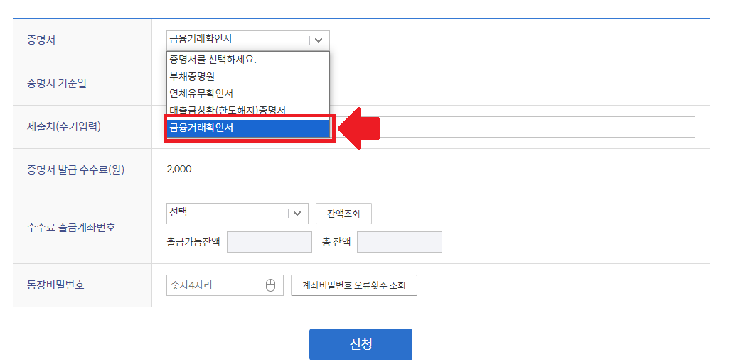 7) 증명서 발급 수수료 2,000원을 지불할 출금계좌번호를 입력하고, 통장비밀번호를 입력한 후, 신청 버튼을 누르면 금융거래확인서를 출력할 수 있습니다.