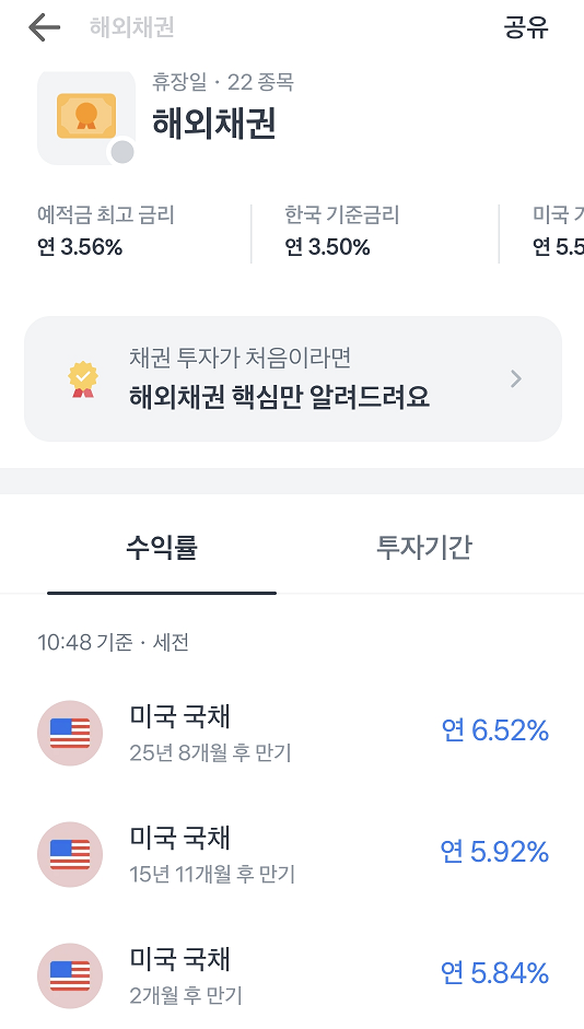 토스 앱에서 증권 탭으로 들어가면 채권이 있습니다. 채권으로 들어가면 미국 국채 상품이 수익률과 투자기간 순서대로 나와있습니다.