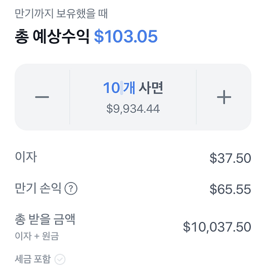 토스증권에서 국채 투자를 할 수 있습니다. 미국 국채는 물론 회사채 등도 투자가 가능합니다. 이자율과 투자기간, 해당 기간 동안 투자했을 때 얻을 수 있는 수익금도 상세하게 알려줘서 상품을 선택하는데 유용합니다.